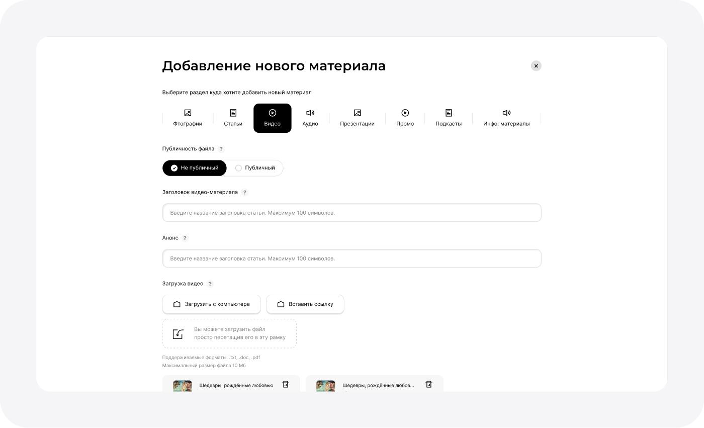 - Публичные ссылкиСотрудник может сгенерировать ссылку на материал и отправить её журналисту. Доступ по ссылке можно закрыть в любой момент (управление правами)