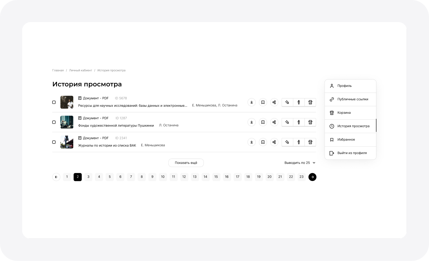 - История и ИзбранноеПользователи видят историю своих просмотров и могут откладывать важные файлы в закладки для быстрой работы